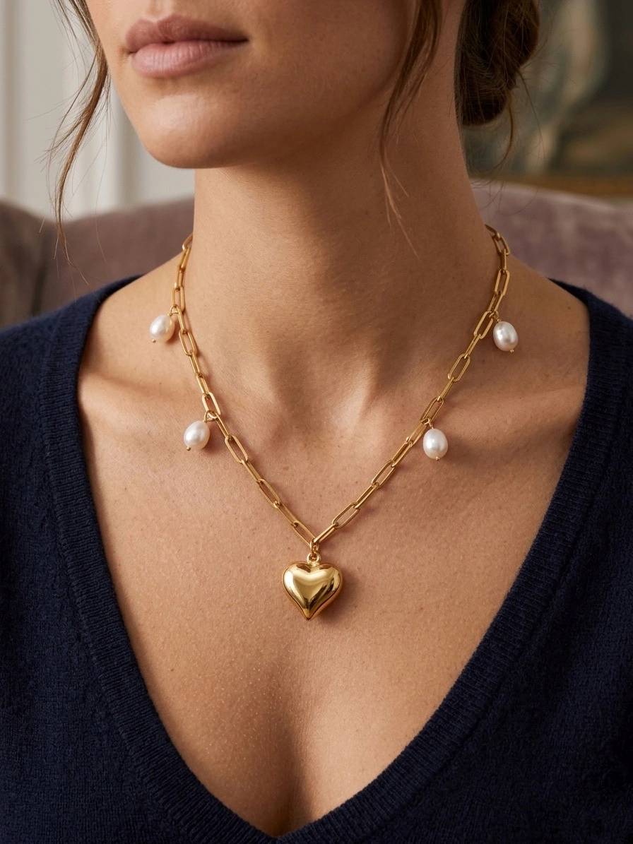 Versatilitate în Stilizare Fie că alegi să îl porți la o cămașă albă desfăcută pentru un look office sofisticat, fie că îl asortezi unei rochii de seară cu decolteu în V, acest colier salbă inimă și perle devine imediat punctul focal al ținutei tale. Structura sa permite suprapunerea (layering) cu alte lănțișoare mai fine, dar are suficientă prezență pentru a fi purtat singur.